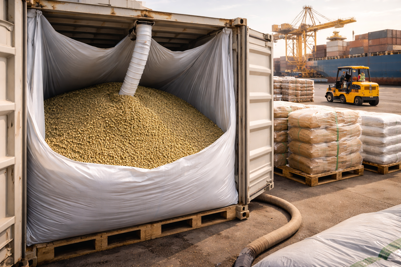Bulk liners (often used with GrainPro or similar moisture-barrier technologies) involve lining a 20ft or 40ft container with a food-grade plastic sleeve.