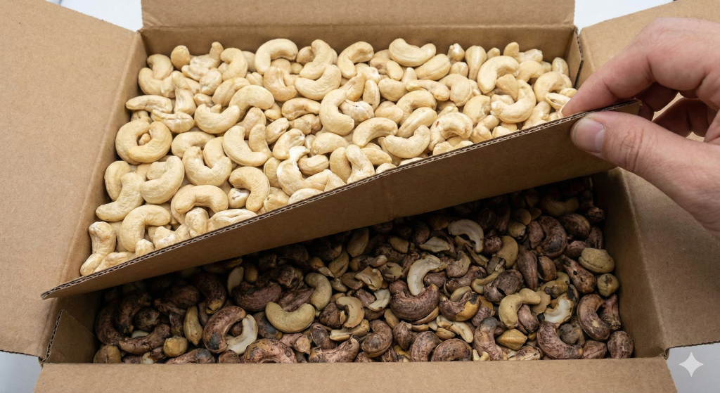 The Nightmare Scenario: You receive a sample of pristine W320 Cashews. You order 5 containers. When they arrive, the top layer of bags looks perfect. But underneath? It’s a mix of smaller sizes, broken pieces, and worst of all—Old Crop mixed with New Crop. The old nuts taste stale and rancid. Your customer rejects the entire lot.